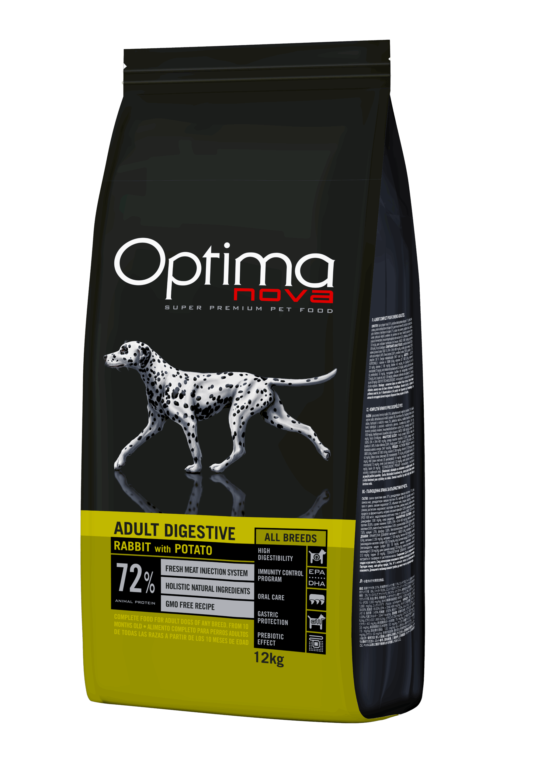 Optimanova Adult Digestive Rabbit & Potato es el único producto del mercado en su categoría que está hecho a base de carne de conejo fresco. Fácil de digerir, sabroso y bajo en calorías, colesterol y grasas, también contiene importantes minerales como hierro, magnesio y zinc., El Omega-3 ayudará a mantener su piel sana y su pelaje brillante. Es perfecto para cualquier tipo de raza. Especialmente para las que tienen digestiones delicadas.