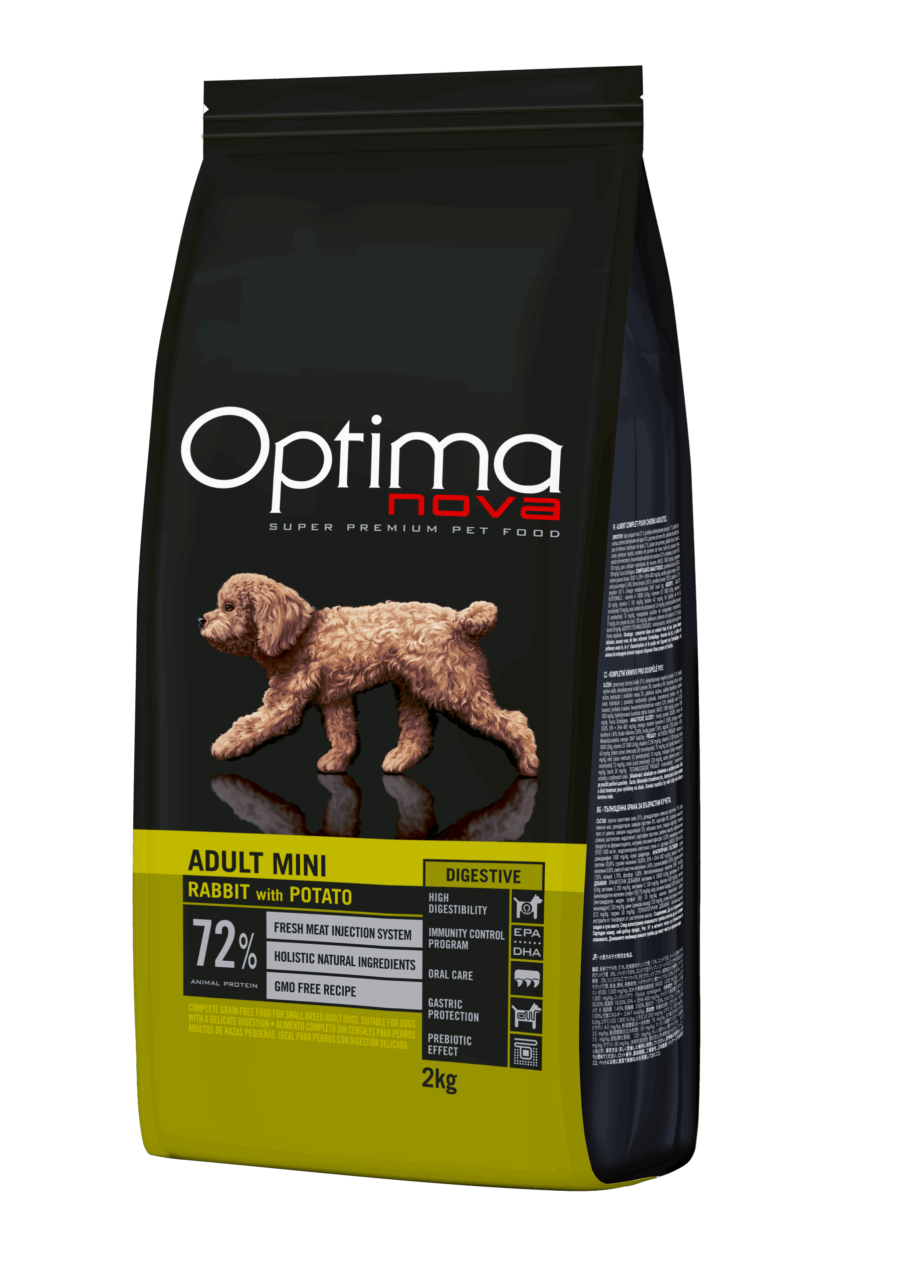 Adult Mini Digestive Rabbit & Potato es el único producto del mercado en su categoría que está hecho a base de carne de conejo fresco. Fácil de digerir, sabroso y bajo en calorías, colesterol y grasas, también contiene importantes minerales como hierro, magnesio y zinc., El Omega3 ayudará a manetener su piel sana y su pelaje brillante. Es perfecto para razas pequeñas o minis. Especialmente para las que tienen digestiones delicadas.