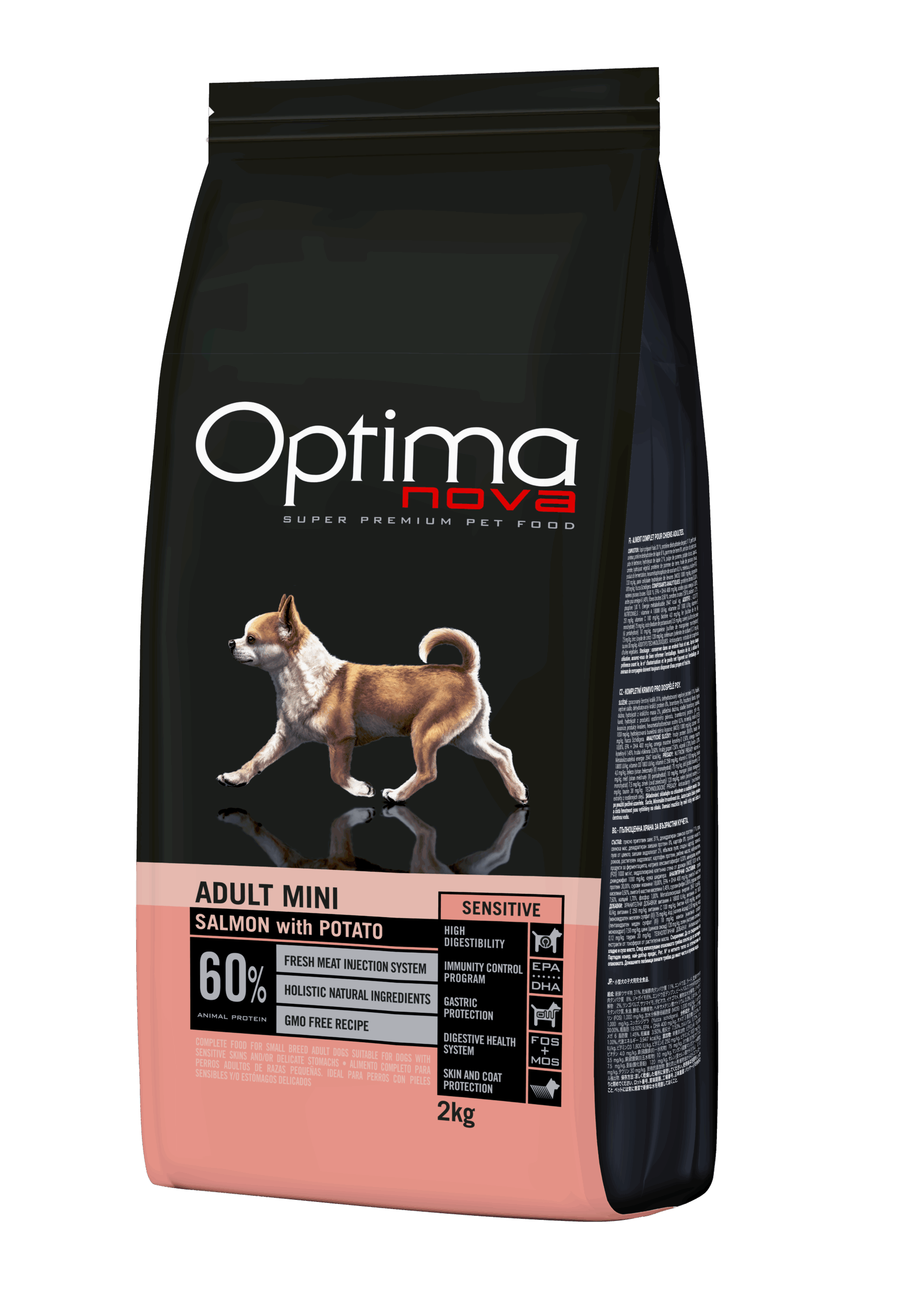 La receta de Optimanova Adult Mini Sensitive Salmon & Potato es perfecta para cualquier raza pequeña o mini, especialmente para aquellas con digestiones sensibles o que requieran un mayor cuidado en la piel y el pelo. El salmón, como única fuente de proteína, lo protegerá de posibles alergias e intolerancias alimentarias. La combinación del zinc, vitamina A, biotina y ácidos grasos Omega-3 y Omega-6 favorecerán la belleza y la salud de su piel, pelo y mucosas. Además el jengibre estimulará la producción de enzimas digestivas facilitando la absorción de los nutrientes.