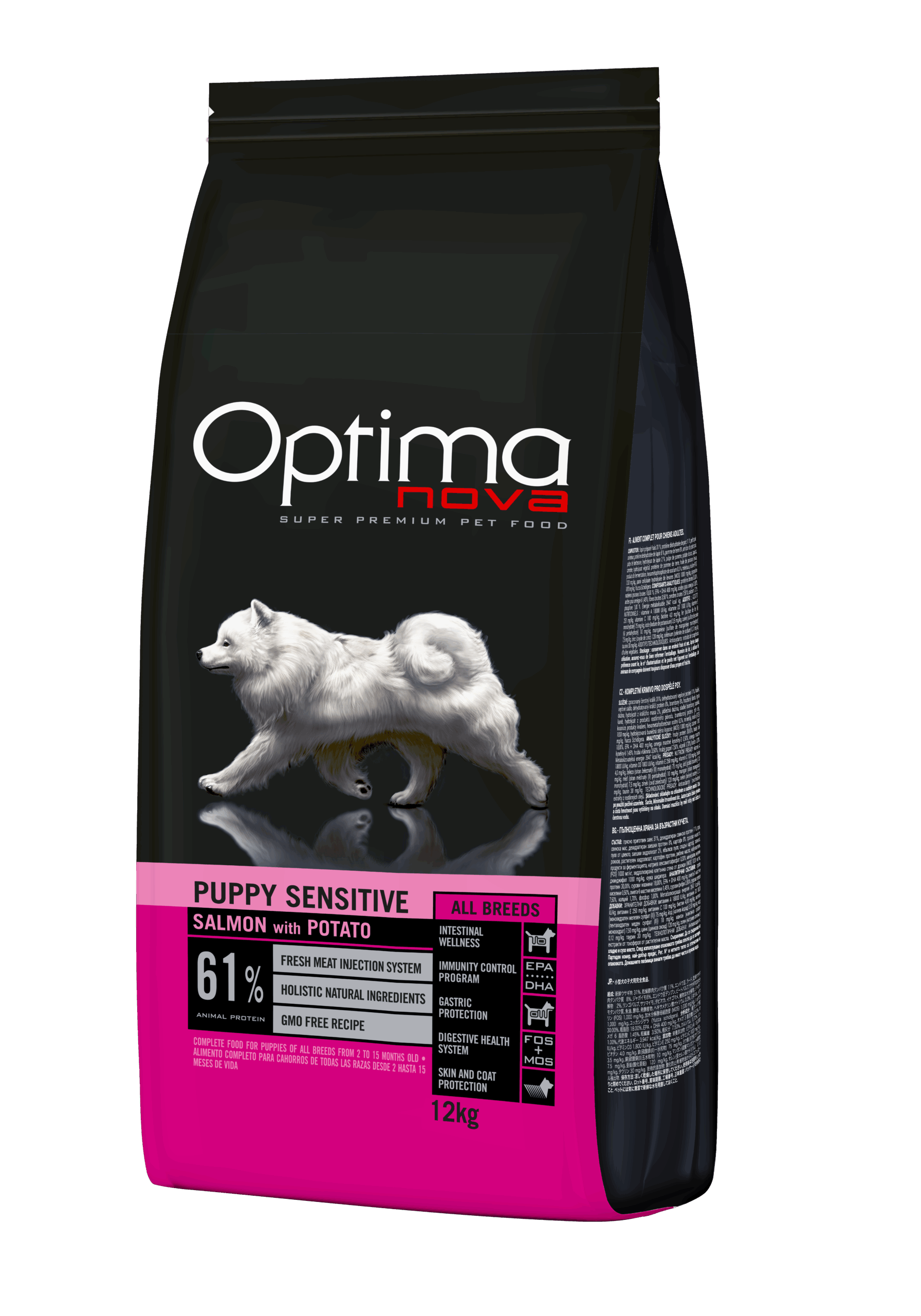 La receta de Optimanova Sensitive Salmon & Potato es perfecta para cualquier raza, sobretodo para aquellos cachorros que al nacer desarrollan problemas de digestión o tienen la piel sensible. El salmón, como única fuente de proteína, lo protegerá de posibles alérgias e intolerancias alimentarias. La combinación del zinc, vitamina A, biotina y ácidos grasos Omega-3 y Omega-6 favorecerán la belleza y la salud de su piel, pelo y mucosas. Además el jengibre estimulará la producción de enzimas digestivas facilitando la absorción de los nutrientes.